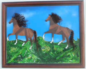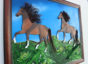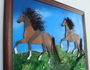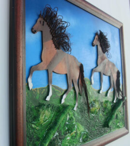 Ακρυλικά σπρέι πάνω σε ξύλινη επιφάνεια  “Merandi-wood” με πολυστερίνη, χάνδρες και κλωστές με βάση μιας νέας τεχνικής