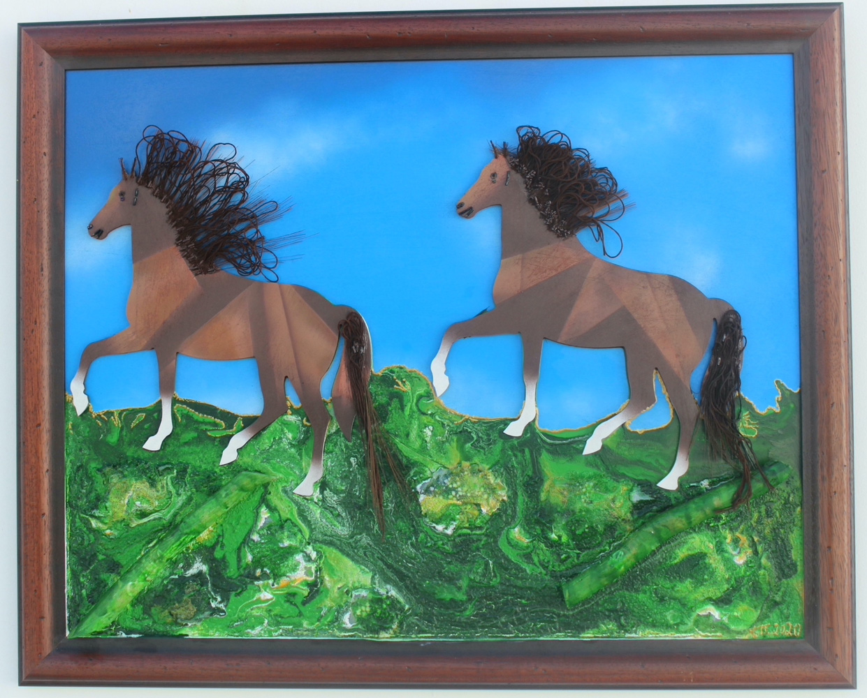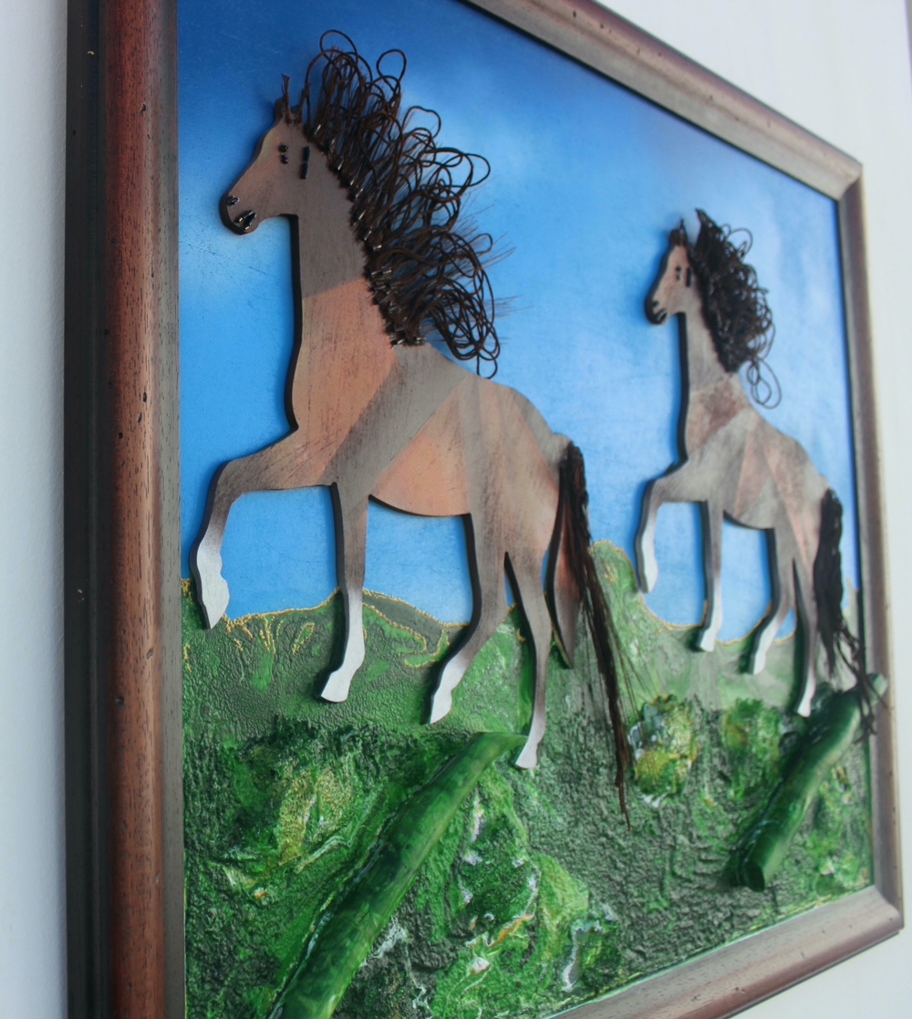 Ακρυλικά σπρέι πάνω σε ξύλινη επιφάνεια  “ Merandi-wood ” με πολυστερίνη, χάνδρες και κλωστές με βάση μιας νέας τεχνικής